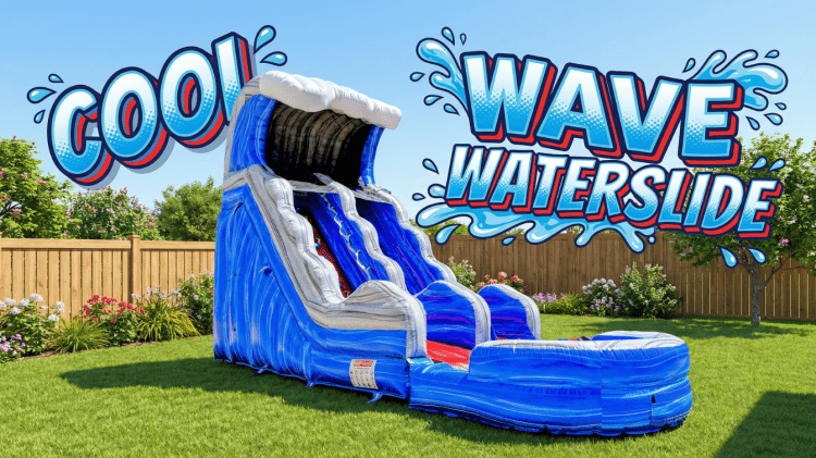 Make a splash at your next event with our Cool Wave Water Slide rental on Long Island! This dramatic, oversized inflatable brings surf-style thrills to backyard parties, school events, summer festivals, and community celebrations. With its towering wave-shaped arch and two parallel sliding lanes, riders enjoy fast, refreshing races that end in a cool cushioned splash pool at the bottom.